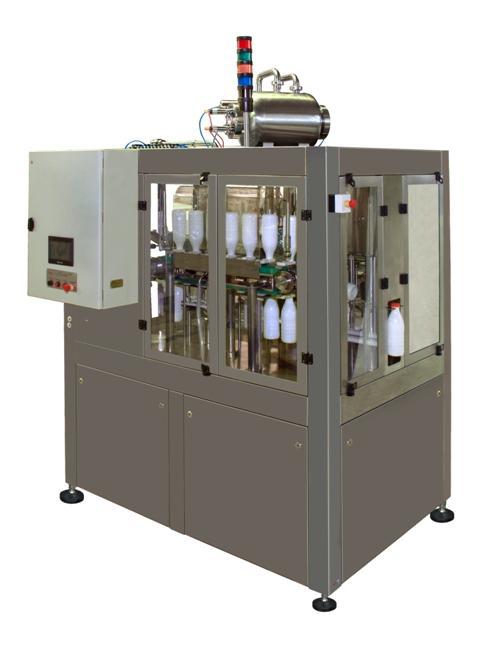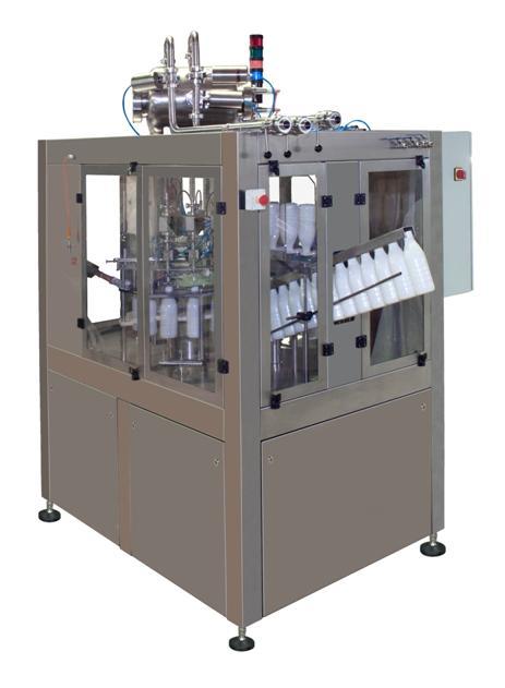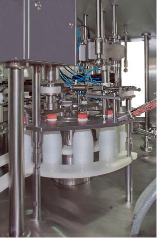 | Блок ополаскивания, розлива и укупорки осуществляет следующие операции: Ополаскивание бутылки проходит подготовленной озонированной водой. Дозирование продукта осуществляется с помощью электромагнитных проточный расходомеров ENDRESS+HAUSER (Германия) или Krohne (Германия) и клапанов мембранного типа в нержавеющем исполнении Gemu (Германия), обеспечивающих высокий уровень микробиологической чистоты конечной продукции. Автоматическое укупоривание винтовой пластиковой пробки происходит на блоке укупорки с помощью системы PICK & PLACE, момент закручивания регулируется при помощи магнитной муфты. Пробка перед укупориванием проходит обработку с помощью ополаскивания озонированной водой. Все операции проходят в условиях подачи чистого воздуха на базе НЕРА фильтра (класс H14 для стерильных помещений, для создания микробиологической чистой зоны розлива продукта. | ||||||||||||||||||||||||||